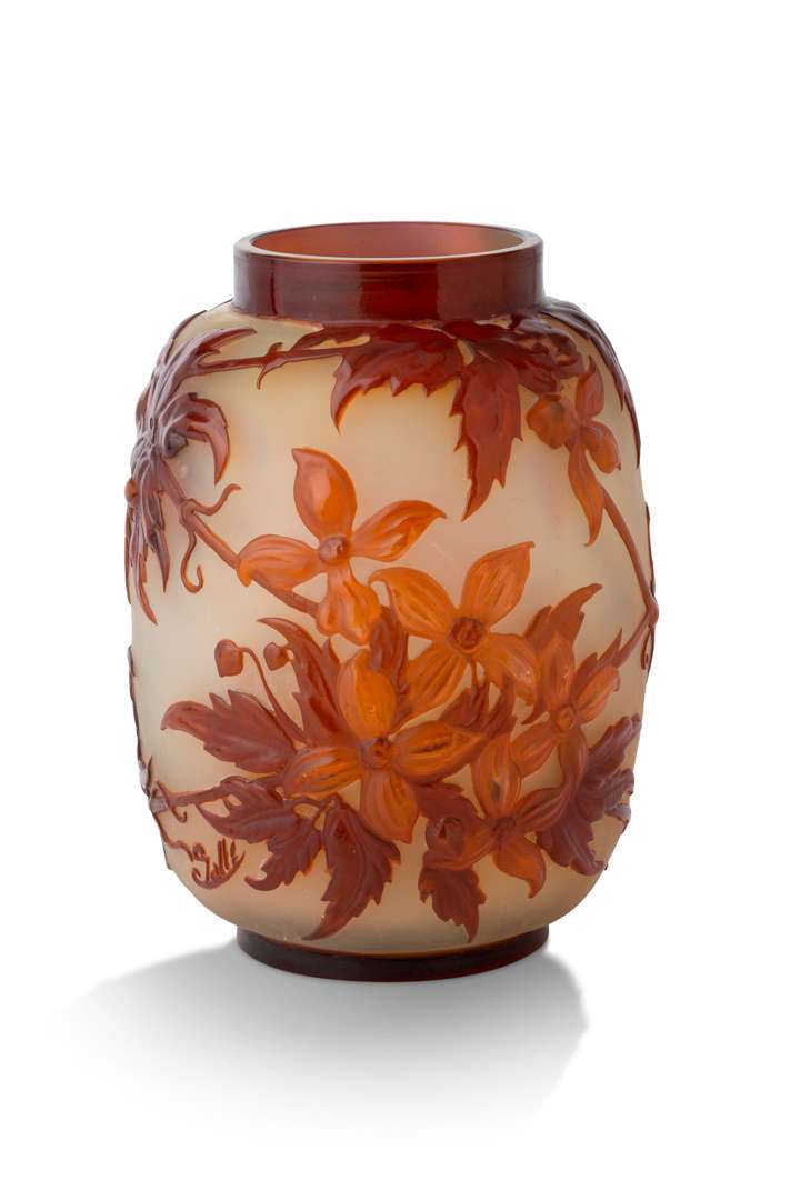 A col resserré, en verre multicouche orange sur fond jaune pâle satiné, à décor gravé à l'acide de clématites.