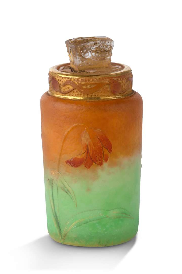 A small bottle and its cap, green and orange multi-layered glass, with acid-etched and enamelled decoration. Signed.