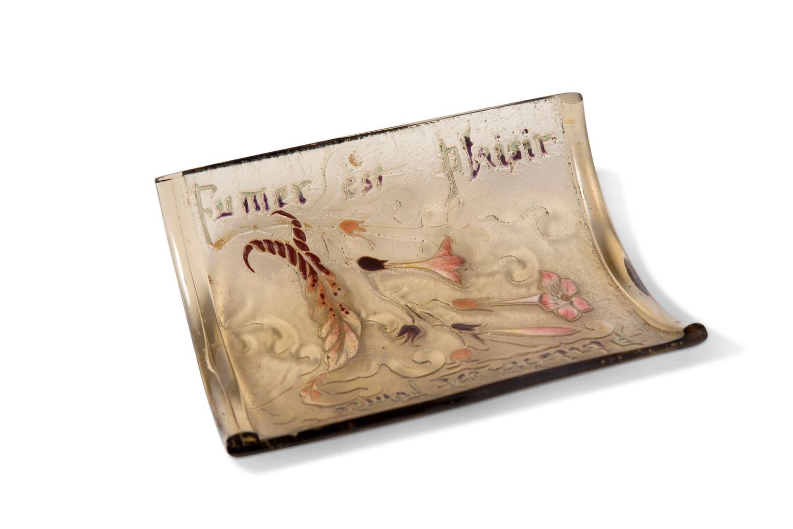 A "Plaisir est fumée - Fumer est plaisir" pocket-divider, c. 1900, amber and frosted glass, acid-etched and enamelled decoration with gold highlights. Signed.