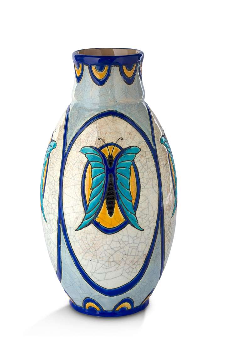 En faïence émaillée polychrome, le corps à décor de papillons, le col et la base animées de frises géométriques.