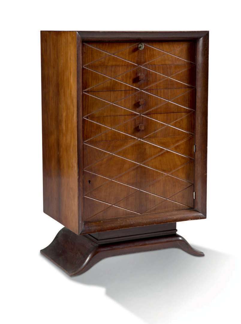 En placage d’acajou, à décor gravé de losanges, ouvrant par quatre tiroirs en façade et un vantail, reposant sur une base en doucine.