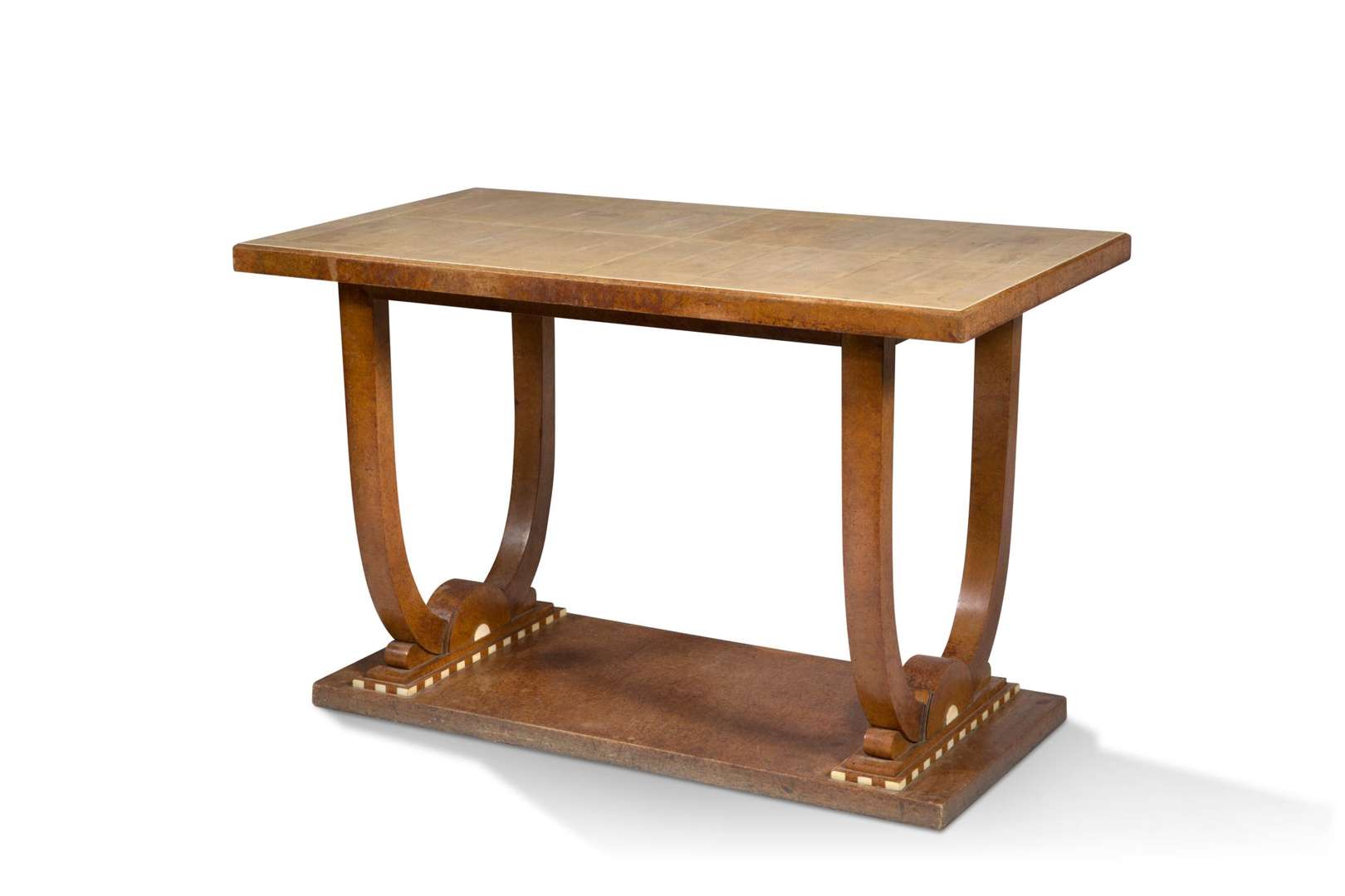 En bois de loupe de noyer, plateau rectangulaire gainé de galuchat bordé de filets d'ivoire, piètement en arc de cercle orné d'une marqueterie d'ivoire à la base, reposant sur une plinthe.