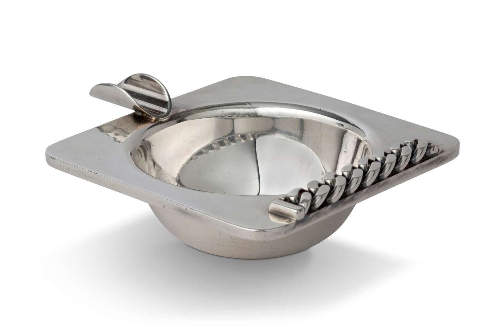 A silver-plated metal ashtray. Signed and stamped.