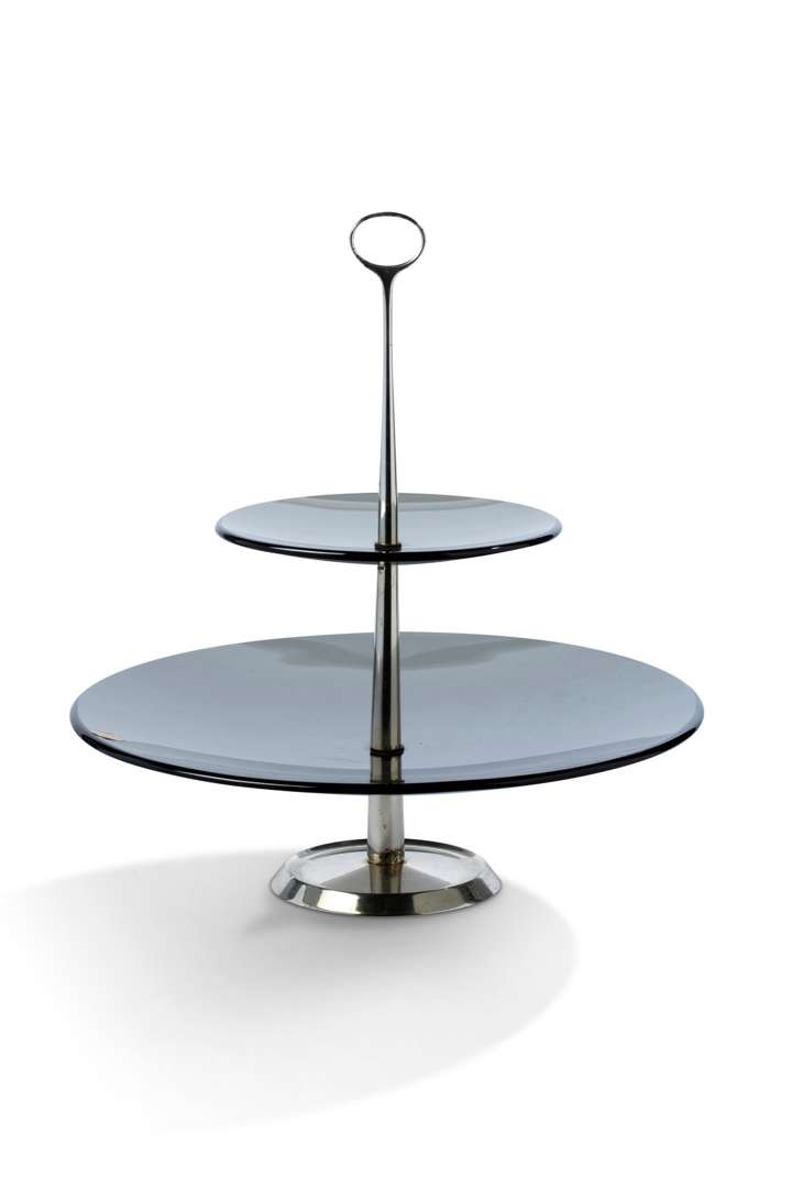 A fruit bowl, chromed metal structure, smoked glass tops.