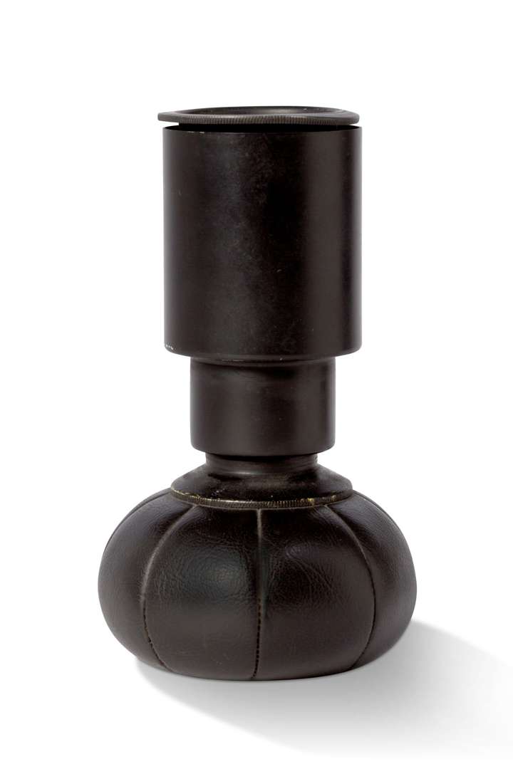 Structure cylindrique en métal laqué noir, base sphérique en skaï noir lestée de billes de plomb permettant une inclinaison réglable.