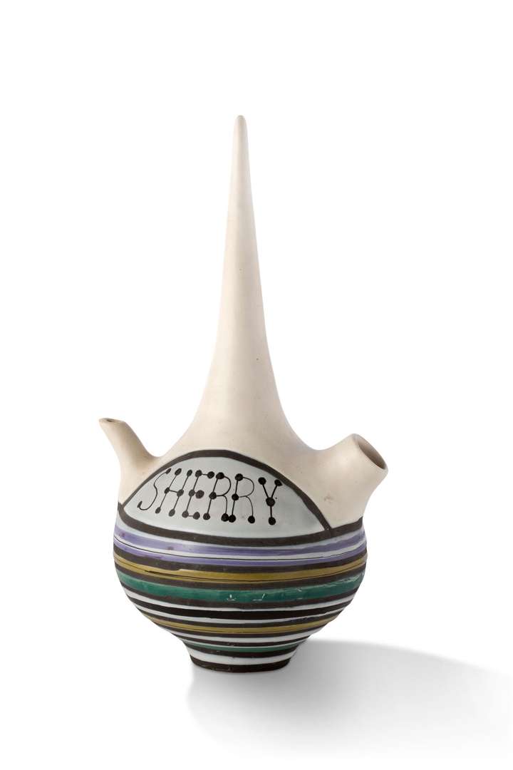 En faïence, à décor polychrome de bandes horizontales en réserve d'émail sur fond engobé noir, inscription émaillée "Sherry", fond émaillé blanc.