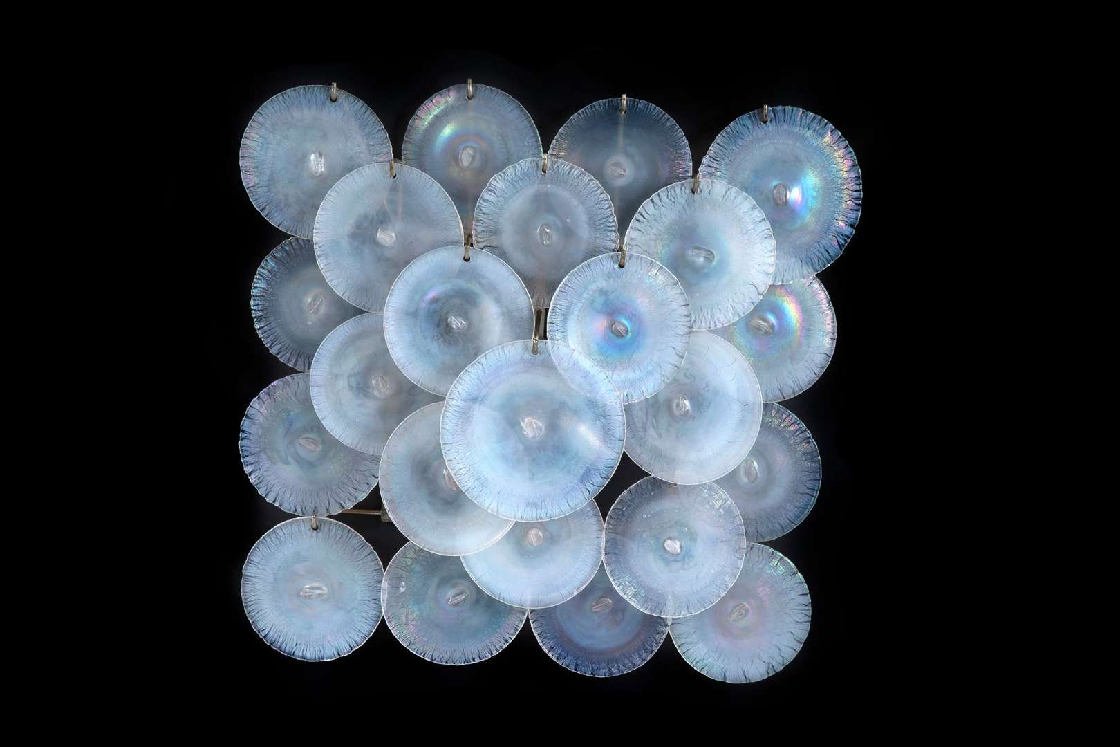 Structure en métal nickelé, accueillant une succession de disques en verre irisé et opalescent.