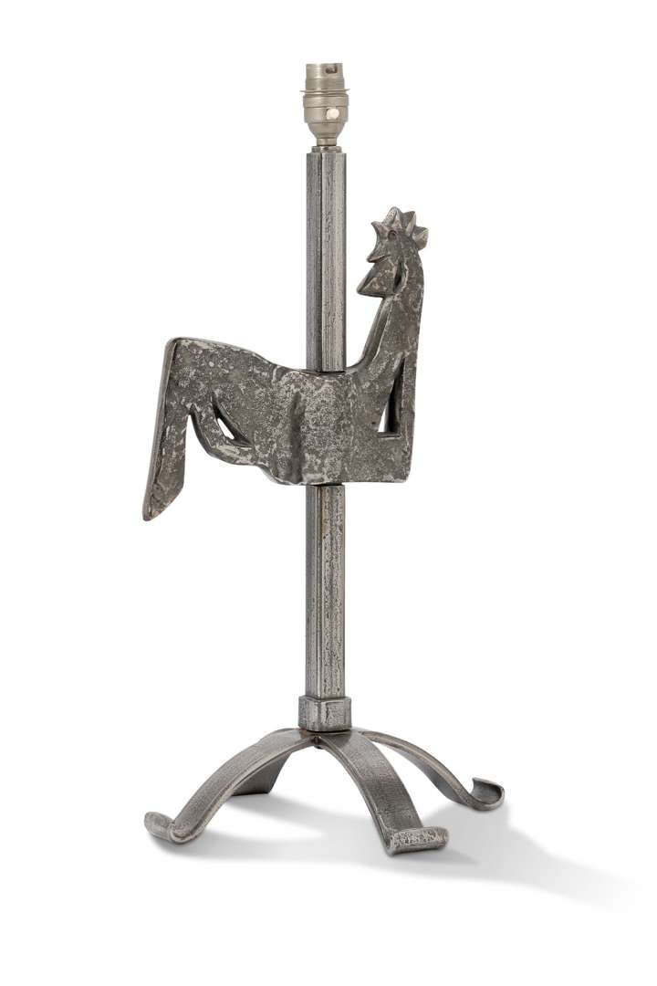 En fer martelé, le fût animé d'un coq stylisé, reposant sur un piètement quadripode.