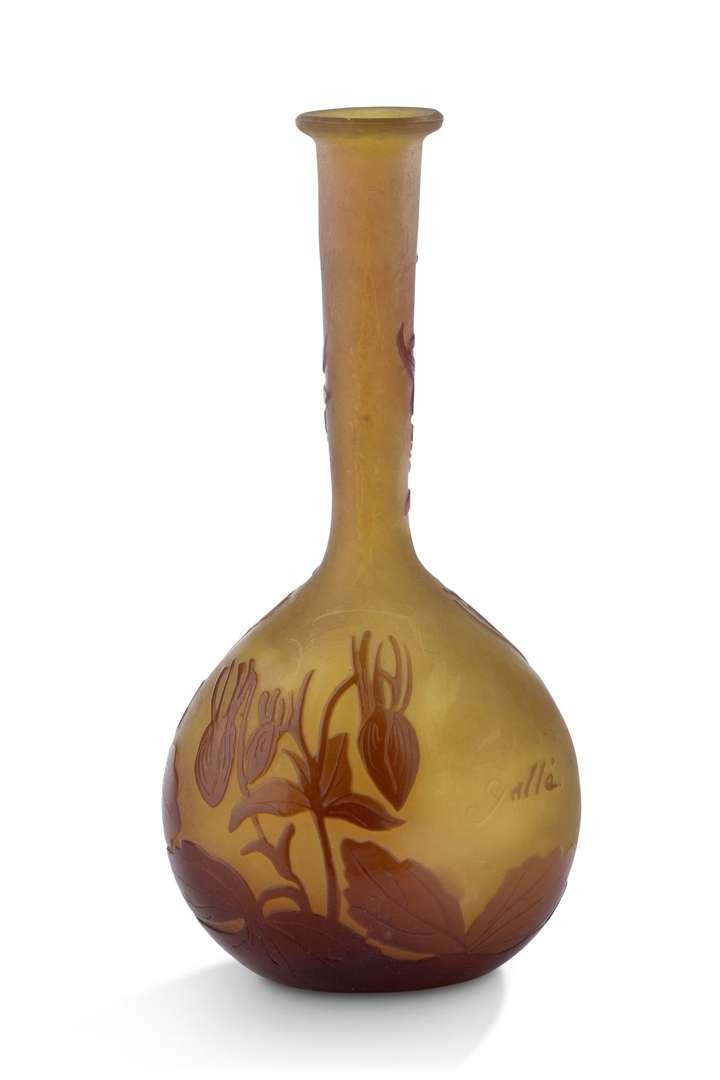 En verre multicouche brun clair sur fond jaune, à décor gravé à l'acide de fleurs.