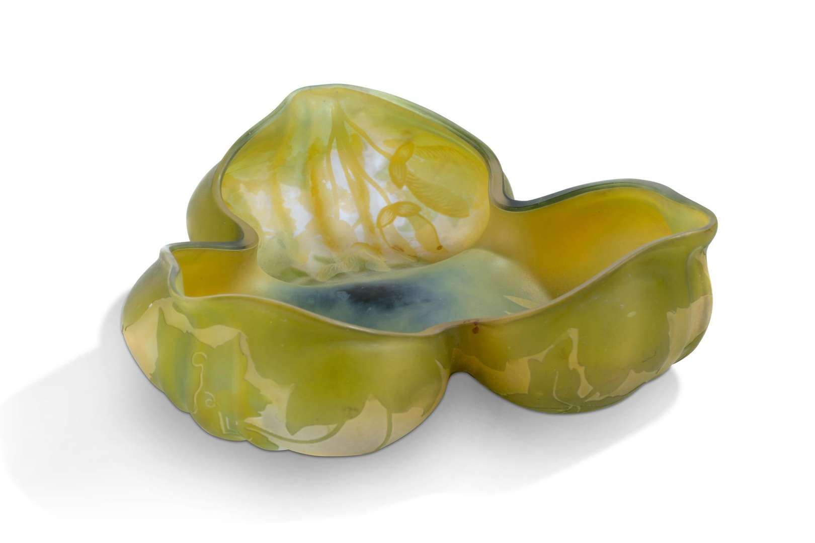 En verre multicouche vert sur fond jaune, à décor gravé à l'acide de feuilles d'érable.
