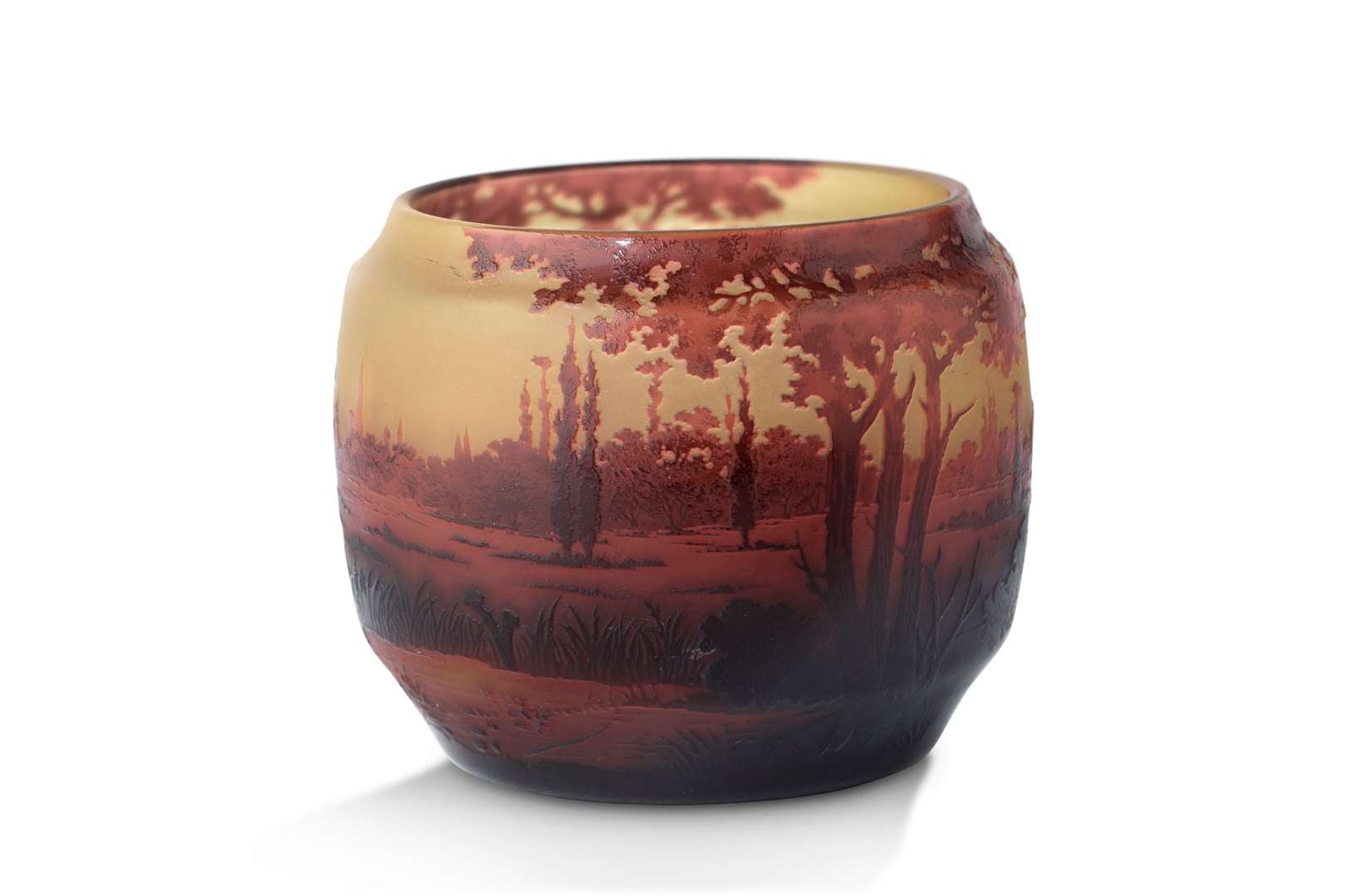 En verre multicouche pourpre sur fond jaune pâle, à décor gravé à l'acide d'un paysage.
