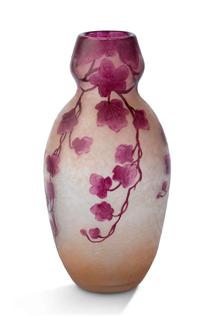 En verre mutlticouche violet sur fond rose grivré, à décor gravé à l'acide de fleurs.