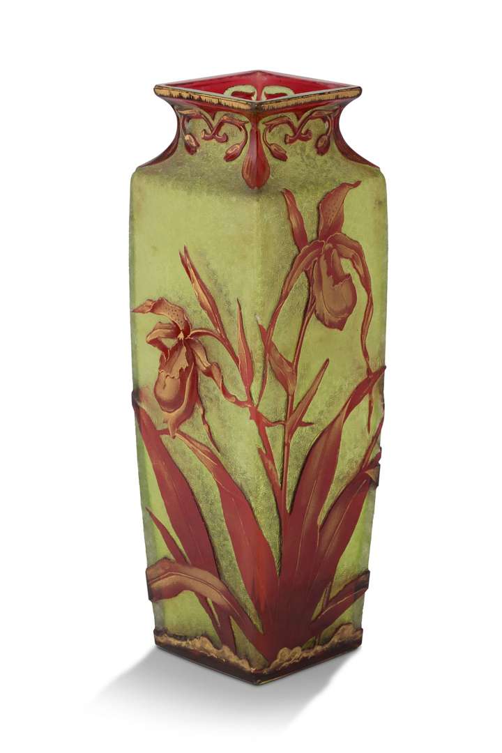 A vase, c. 1900, red and green crystal, acid-etched decoration with golden highlights.