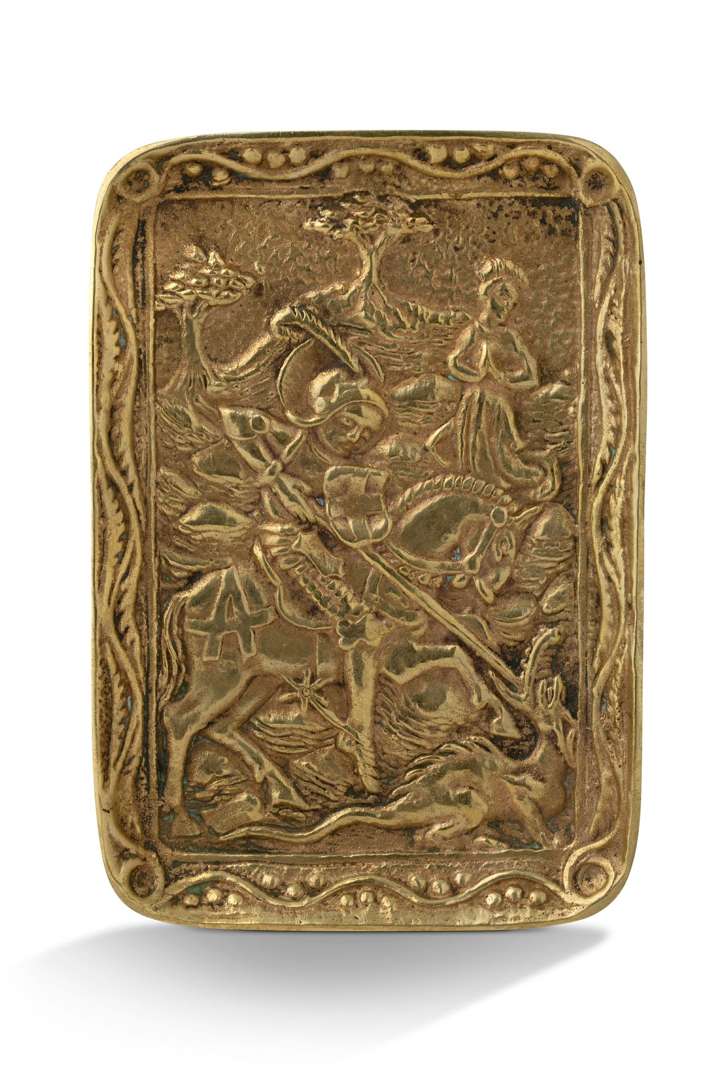 En bronze doré, orné du motif de Saint Georges terrassant le dragon.