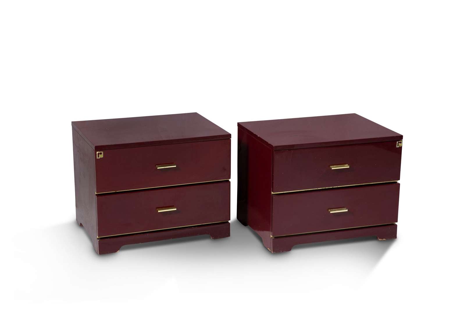En bois laqué bordeaux, ouvrant par deux tiroirs en façade, prises en métal doré.