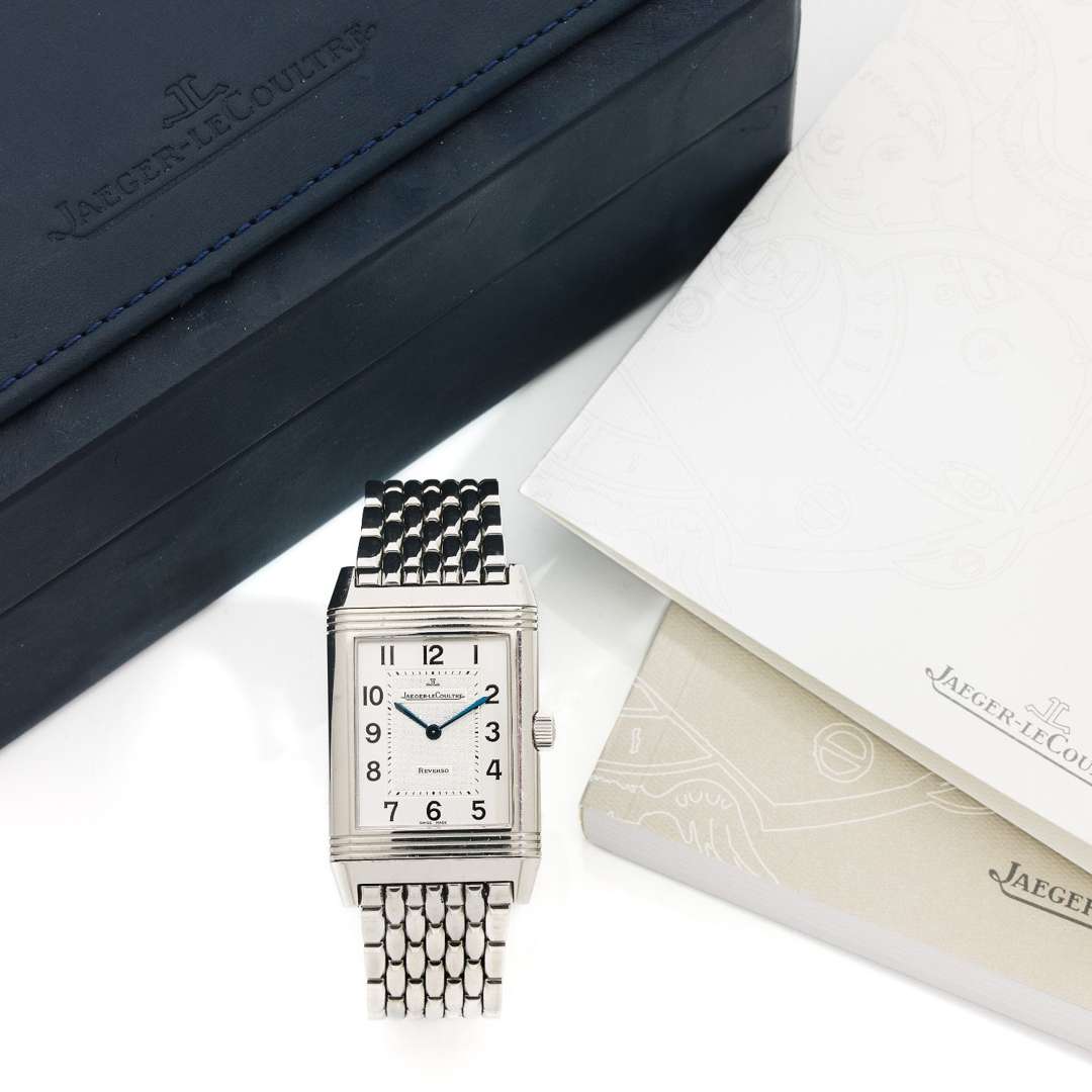Avec : écrin et surboîte, une pochette en feutrine grise et certificat de garantie Jaeger Le Coultre en date du 04/12/04 et un livret