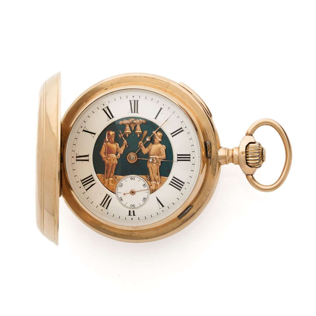 A 18k gold keyless hunting cased pocket watch with automaton and repeating mechanism