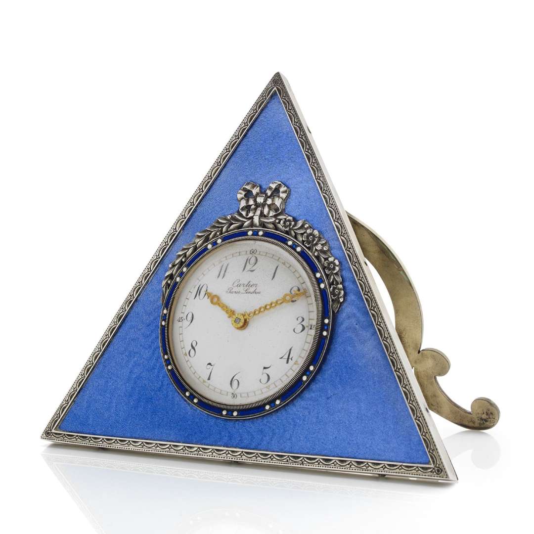 Boîtier : triangulaire sur chevalet, la partie centrale décorée d'un émail translucide bleu, la lunette émail bleu avec points blancs, le chevalet signé "Cartier Paris" et le dos du boîtier numéroté "1094"