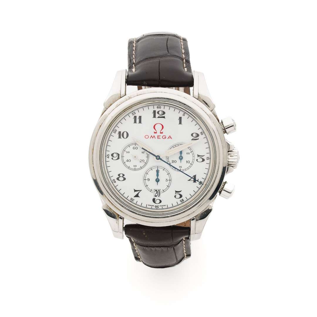 A stainless steel automatic chronograph wristwatch by Omega with Olympic logo to the case back