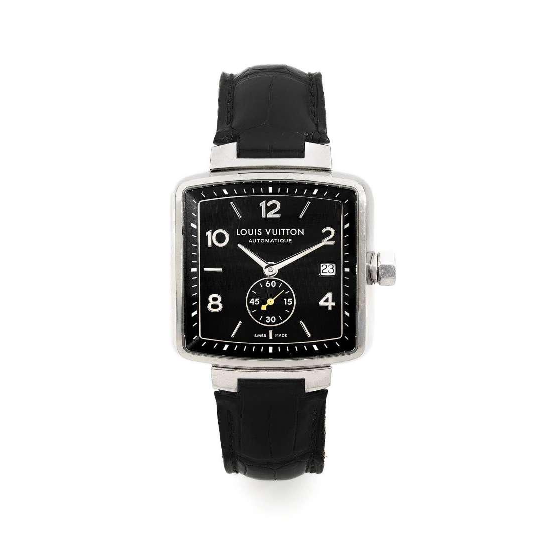 A stainless steel automatic wristwatch by Louis Vuitton with a stainless steel buckle signed