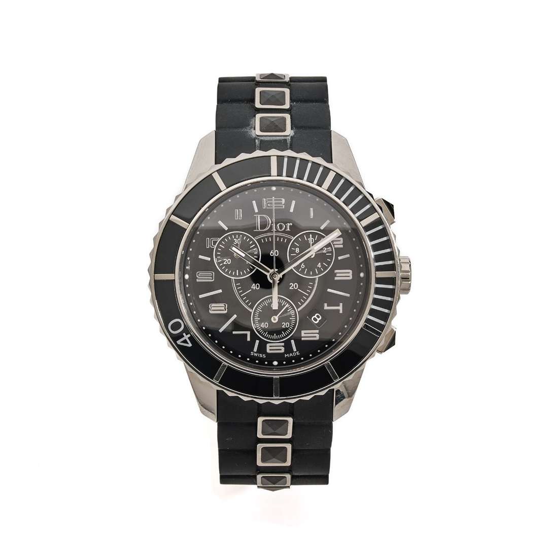 A stainless steel quartz chronograph wristwatch by Dior with rubber strap and stainless steel deployant clasp, signed