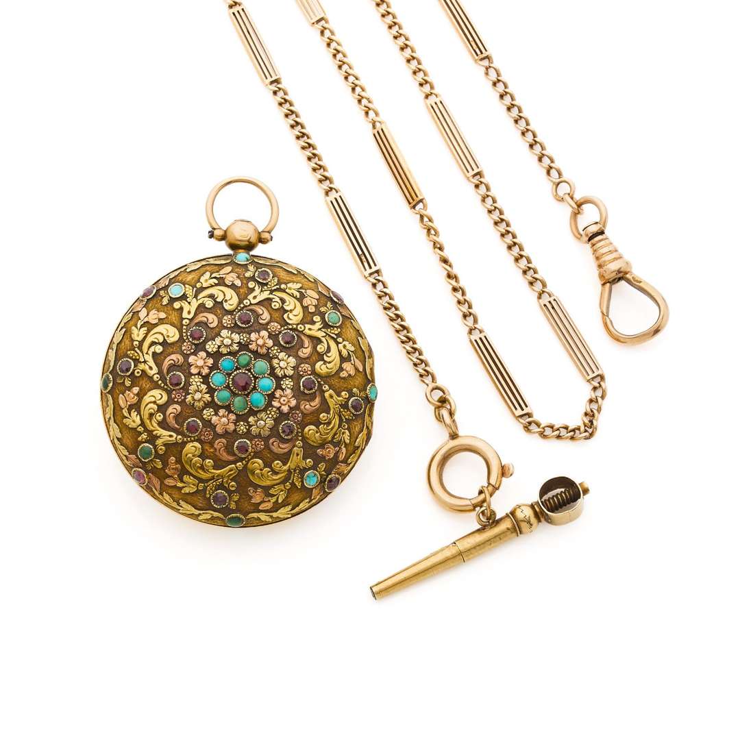 A various colored gold key winding pocket watch set with turquoises accompanied by a gold chain and winding key