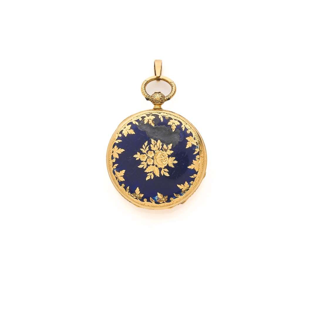 Boîtier : rond sur charnière, le dos émail bleu (restaurations visibles), cuvette en or signée "Bourdin 28 rue de la Paix - Paris"