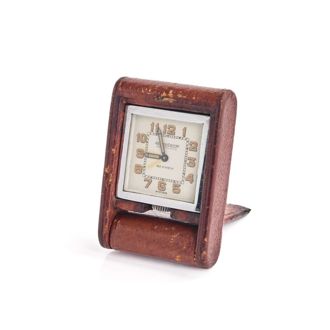 A chromium plated and leather travel clock by Jaeger Le Coultre, retailed by Hermès