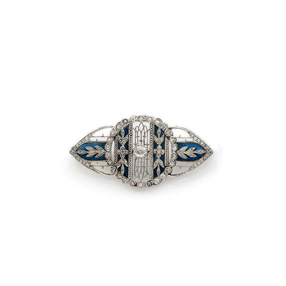 An enamel, diamond, platinum and gold brooch