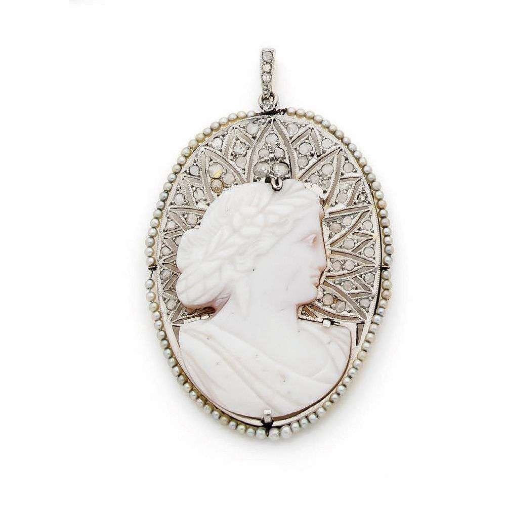 Camée sur coquille, diamants taille rose, perles supposées fines, non testées