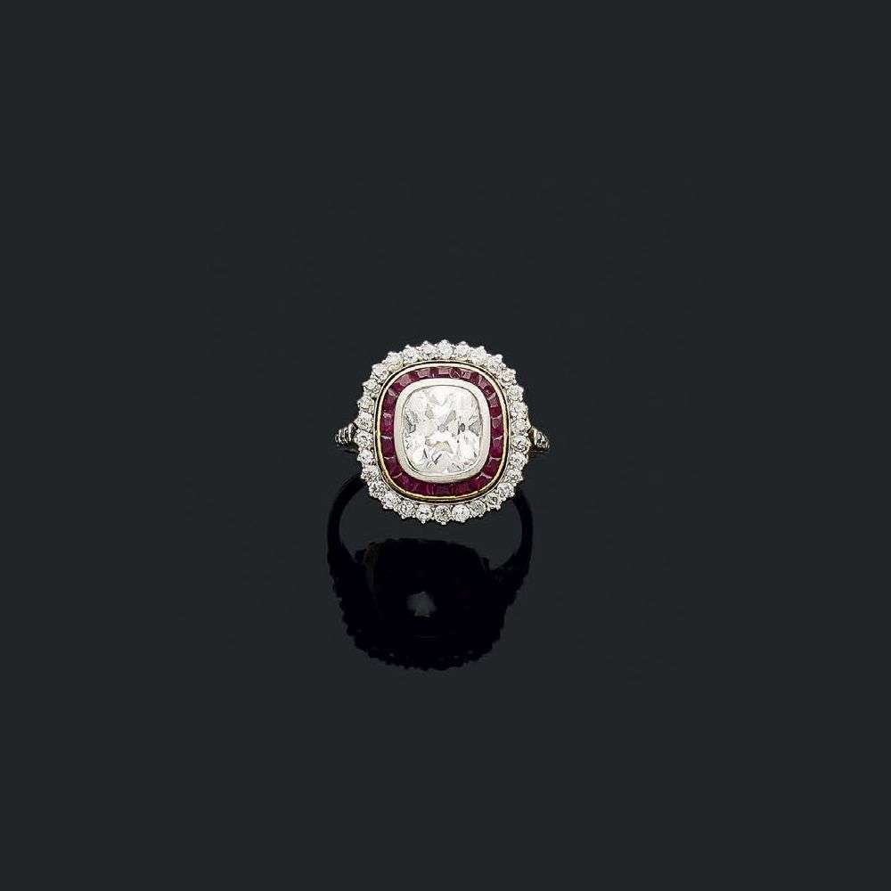 Diamant coussin taille ancienne, diamants ronds taille ancienne et rubis calibrés
