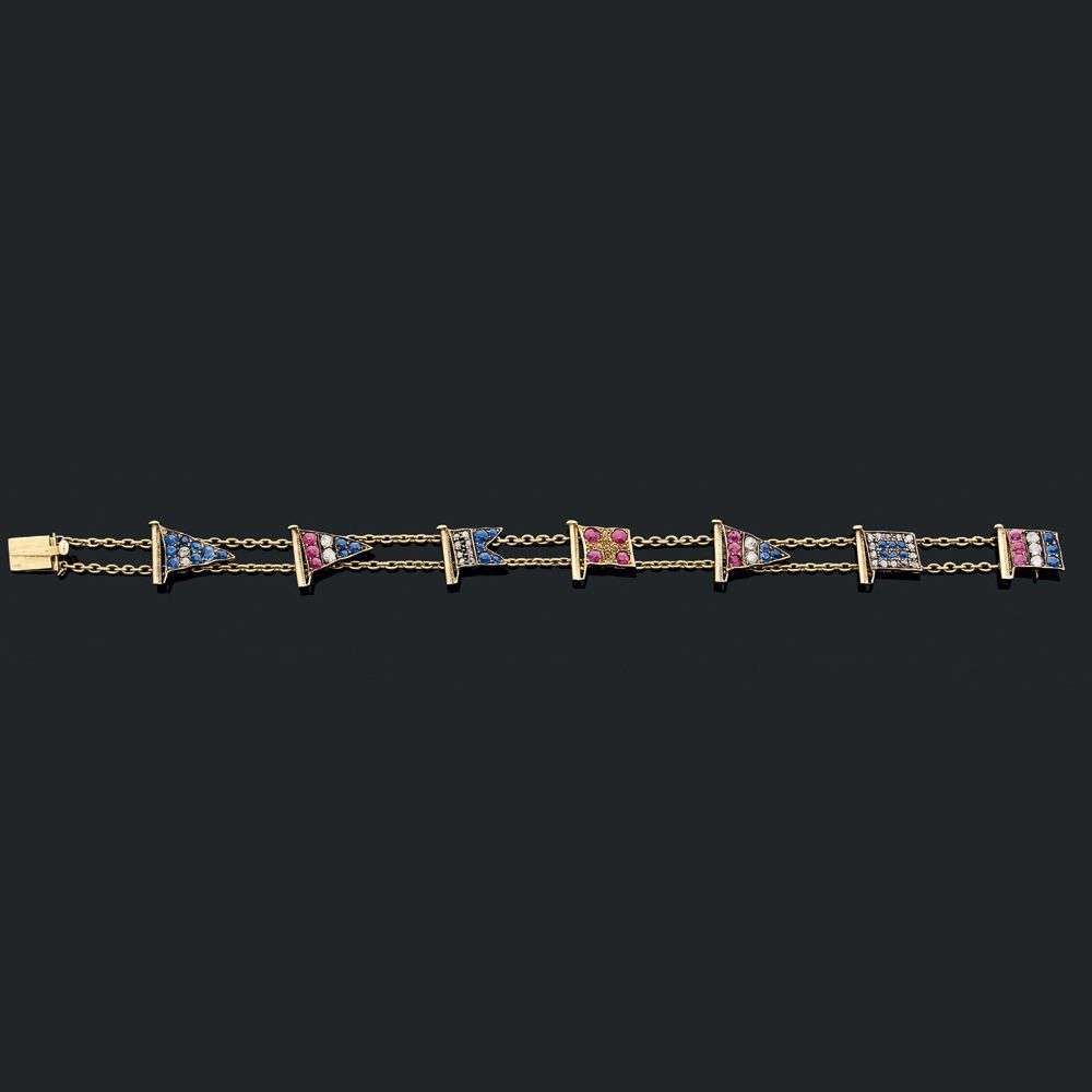 Ce bracelet en or et pierres précieuses représente différents fanions de navigation et porte le mot anglais «Dearest» («très cher») à son revers. Il fut probablement offert avant un voyage en mer ou en souvenir d'un cabotage. À la fin du XIXe siècle, de nombreuses nouvelles fortunes enrichies par l'activité industrielle, notamment en Angleterre et aux USA, acquièrent des bateaux pour faire du cabotage et se divertir. Les fanions de ces bateaux de loisirs délivrent des messages tels que «J'ai un scaphandrier en plongée, tenez-vous à distance», «Je bats en arrière» ou encore «Je fais du cabotage». Ce bijou témoigne de l'essor des activités de plein air à cette époque.