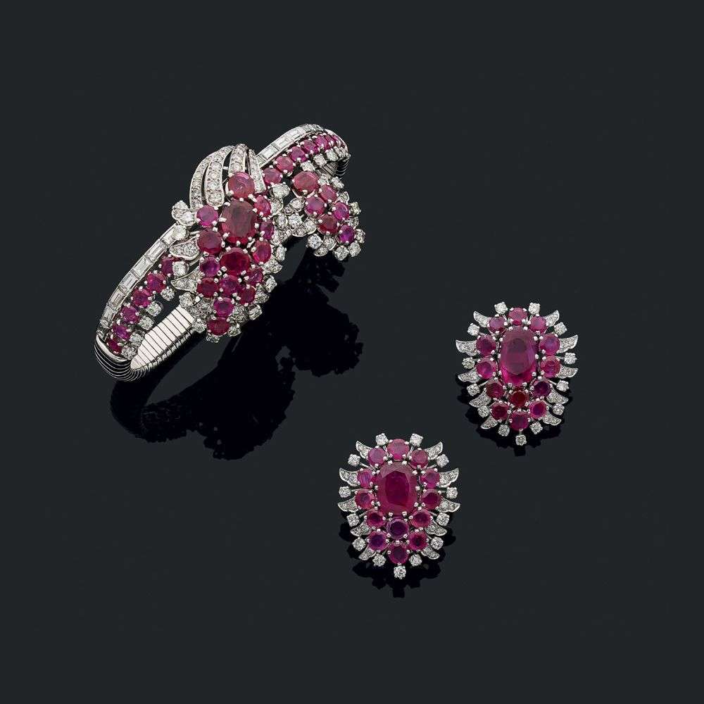 Ruby, diamond and gold bracelet and earrings, report for the bracelet
