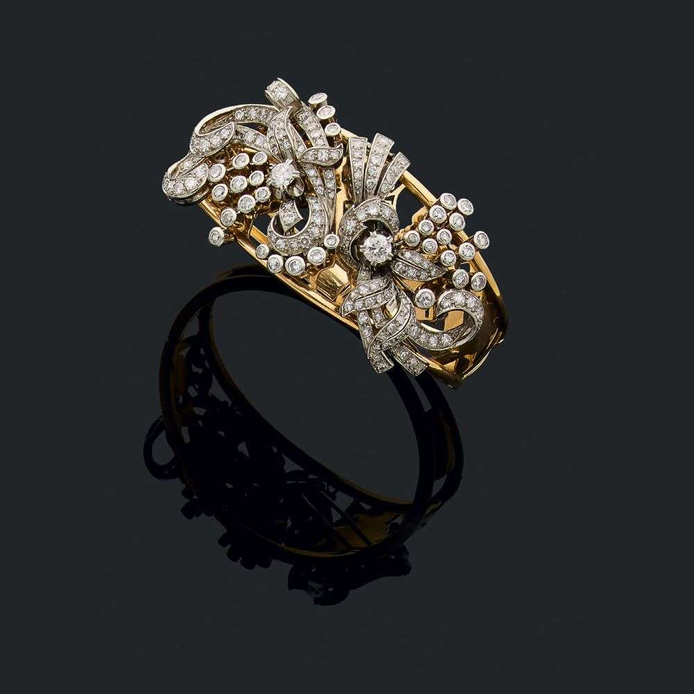 Diamond, platinum and gold bracelet and brooches