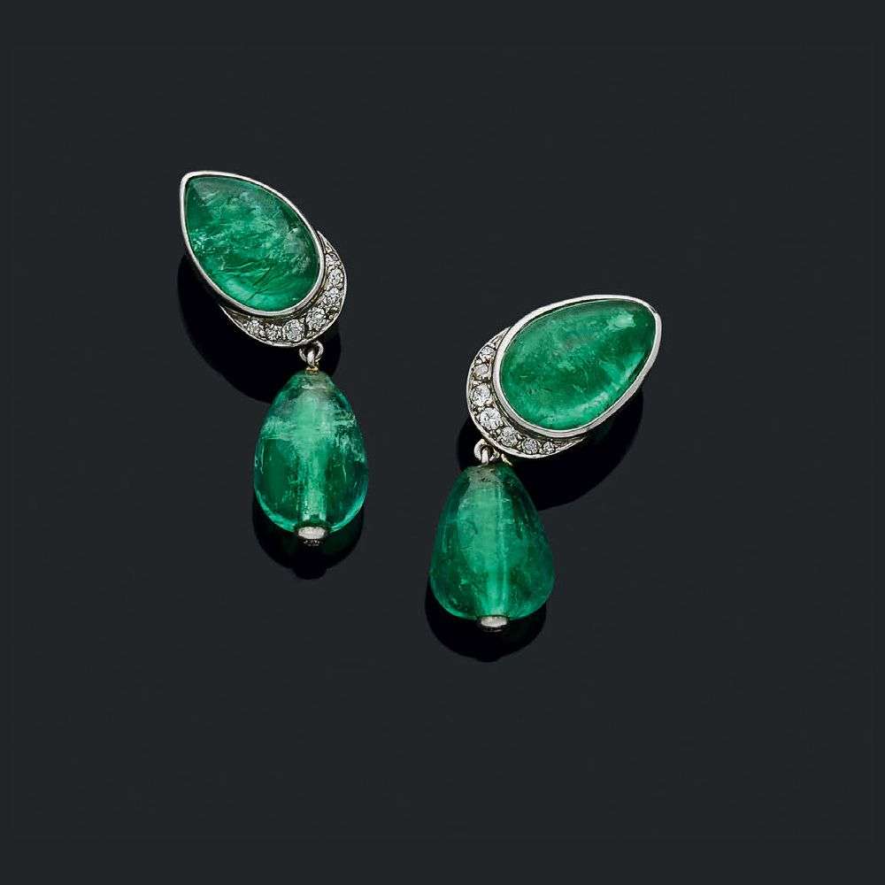 Émeraudes en goutte, cabochons d'émeraude et diamants ronds