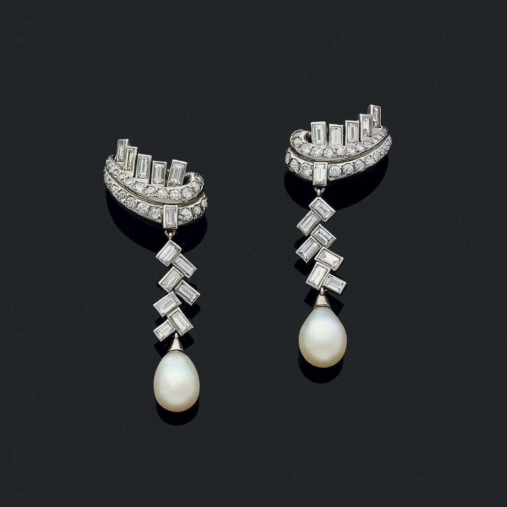 Natural pearl, diamond, platinum and gold earrings by Suzanne Belperron. Olivier Baroin certificate and LFG report.