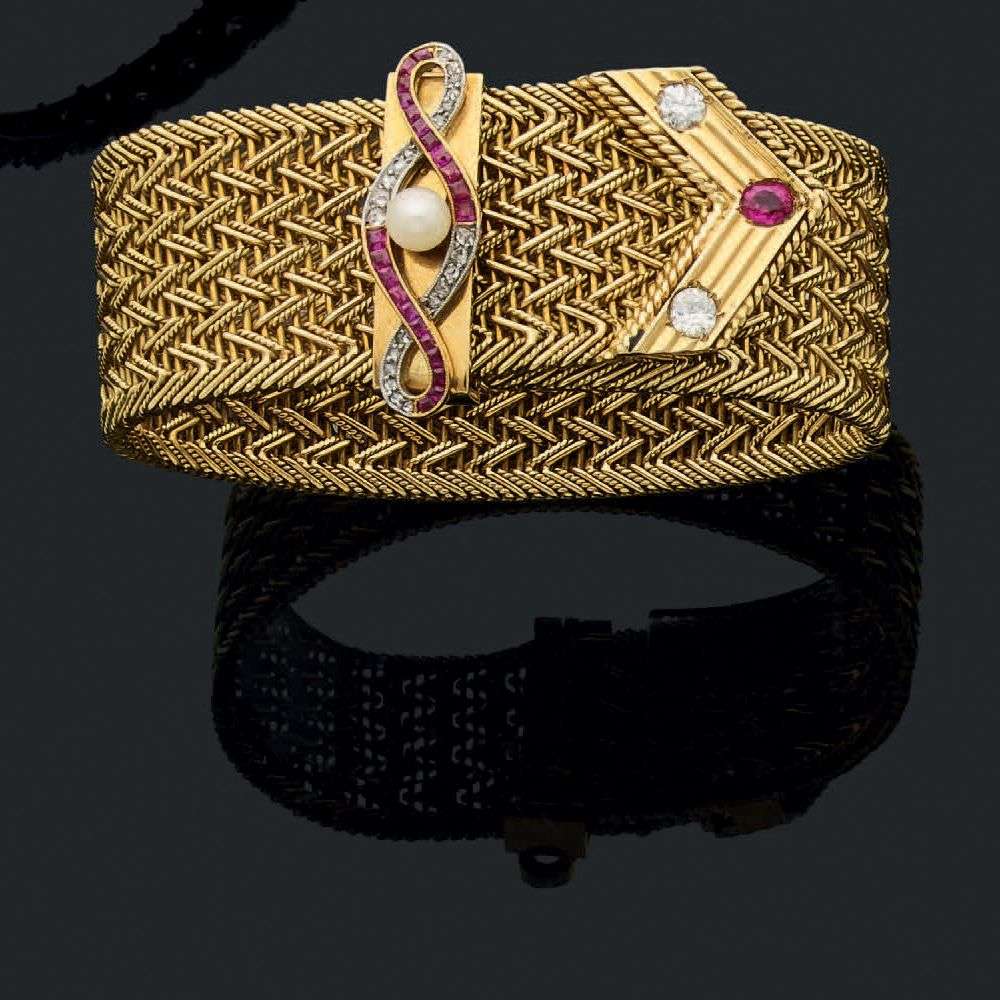 A ruby, pearl, diamond, gold and platinum bracelet