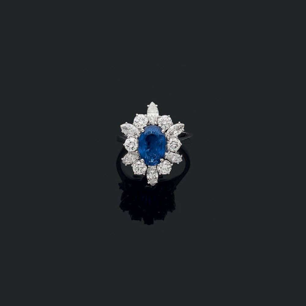 Saphir ovale, diamants ronds taille brillant et navettes