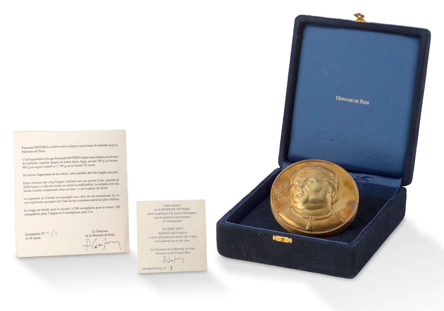 Cette médaille en or massif 18 carats est ainsi numérotée I/III sur la tranche, où elle arbore également la corne d’abondance, poinçon de la Monnaie de Paris garantissant sa provenance et son authenticité. L’objet, rarissime, est signé sur la face arborant l’autoportrait de l’artiste, tandis que sur l’autre face est représentée une des oeuvres les plus célèbres de Botero, exposée fièrement devant l’Arc de Triomphe. D’un exceptionnel relief pour ce type de production, il fallut cinq frappes consécutives sous une presse de 2 500 tonnes à la Monnaie de Paris afin d’obtenir un résultat aussi contrasté.