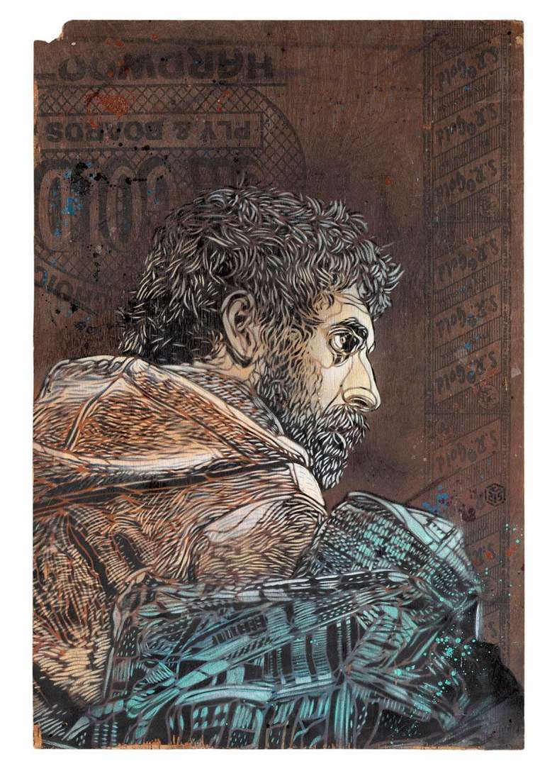 Peinture aérosol et acrylique sur panneau de bois, signée à droite, contresignée au dos
