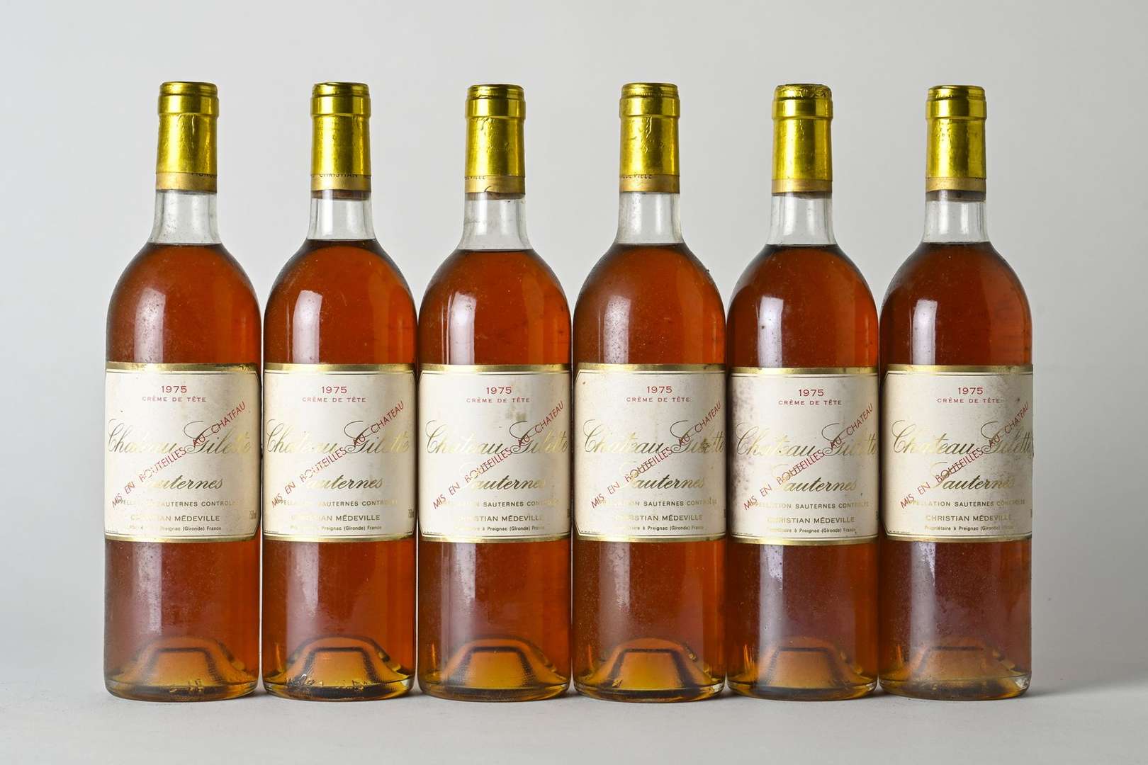 6 B CHÂTEAU GILETTE CRÈME DE TÊTE (Caisse Bois d'origine) (1 B.G| 5 T.L.B| e.t.h| sur-capsules négoce) - 1975 - Sauternes