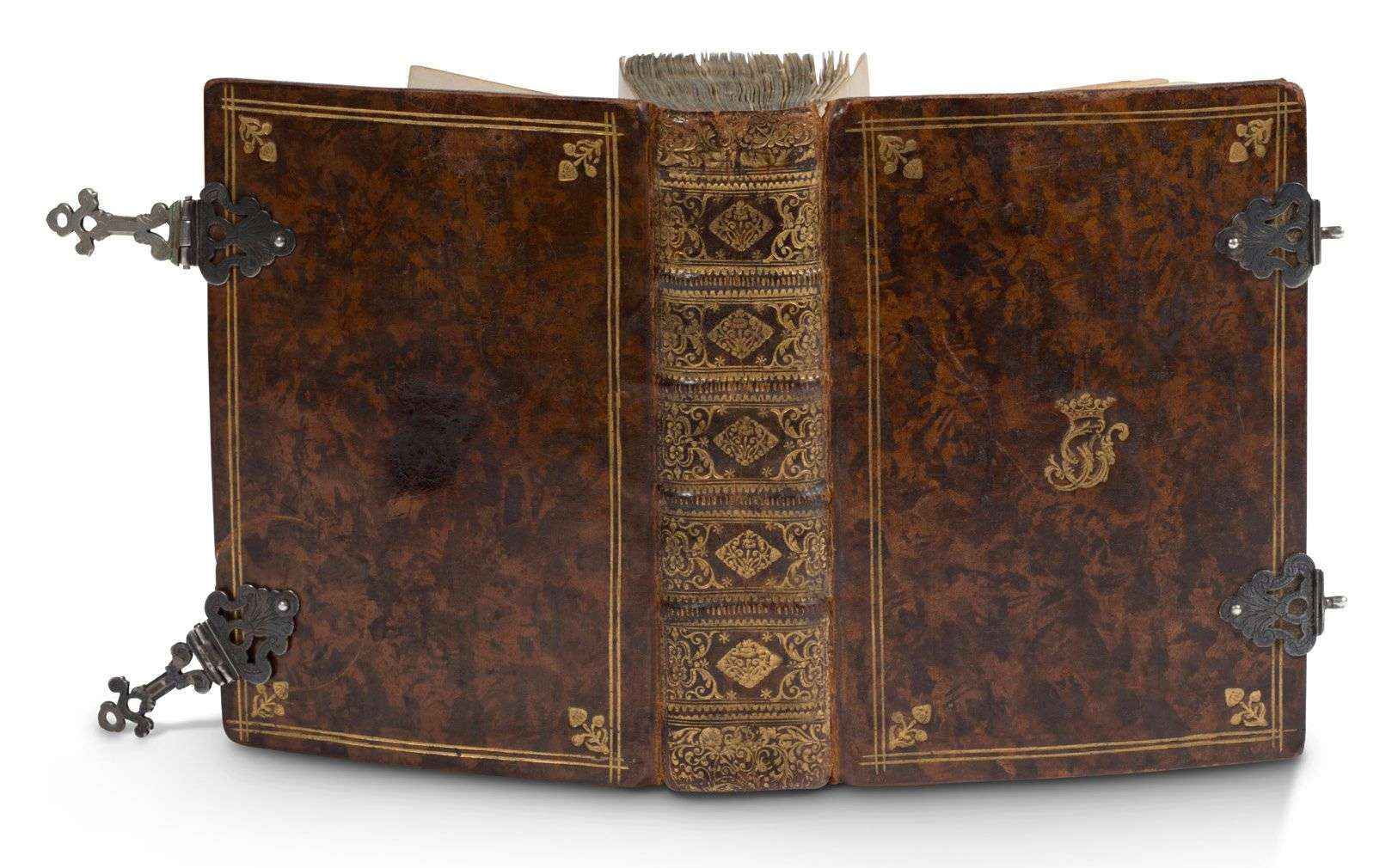 140 x 100 mm (83 x 60 mm)| 19 longues lignes à l'encre carbone sur parchemin, réglures à la mine de plomb| textualis libraria, une main pour l'ensemble de manuscrit| 5 initiales historiées et une initiale peinte sur 10 lignes avec encadrement, 22 lettres champies à antennes ornées de fleurs trilobées dorées, petites feuilles vertes libres et besants dorés, dorures à la feuille, lettrines rouges et bleues, bout-de-lignes (litanies), rubriques. Reliure postérieure du XIXe dans le goût du XVIIIe: plein veau marbré, dos à 5 nerfs ornés de caissons dorés, double filet d'encadrement sur les plats avec petits fers aux coins et chiffre « JV »(?) en lettres gothiques à couronne de marquis au centre, fermoirs en argent, roulette sur les coupes, tranches mouchetées de bleu, jaune et rouge| coins frottés avec petit manque à l'un d'eux, trace circulaire du fermoir au dos, chiffre gratté au plat inférieur (150 x 110 mm). Livres d'heures à l'usage d'Utrecht similaire dans l'iconographie au groupe des Sarijshandschriften de Zwolle.