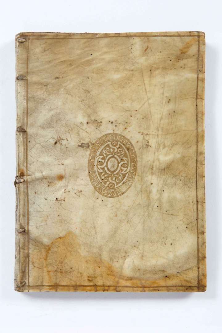 Ortelius. Antverpiae, P. Gallaeus excudebat, 1573. Petit in-4, [4] f. (dont le titre gravé), [53 (sur 54)] planches, [2] f., velin ivoire époque, dos lisse et muet, roulettes et fleurons dorés, plats bordés d'un filet et ornés d'un médaillon central, le tout doré, tranches dorées (taches et griff. sur la rel., trou, tache et signature grattée en marge du titre, mouillure en début de vol.