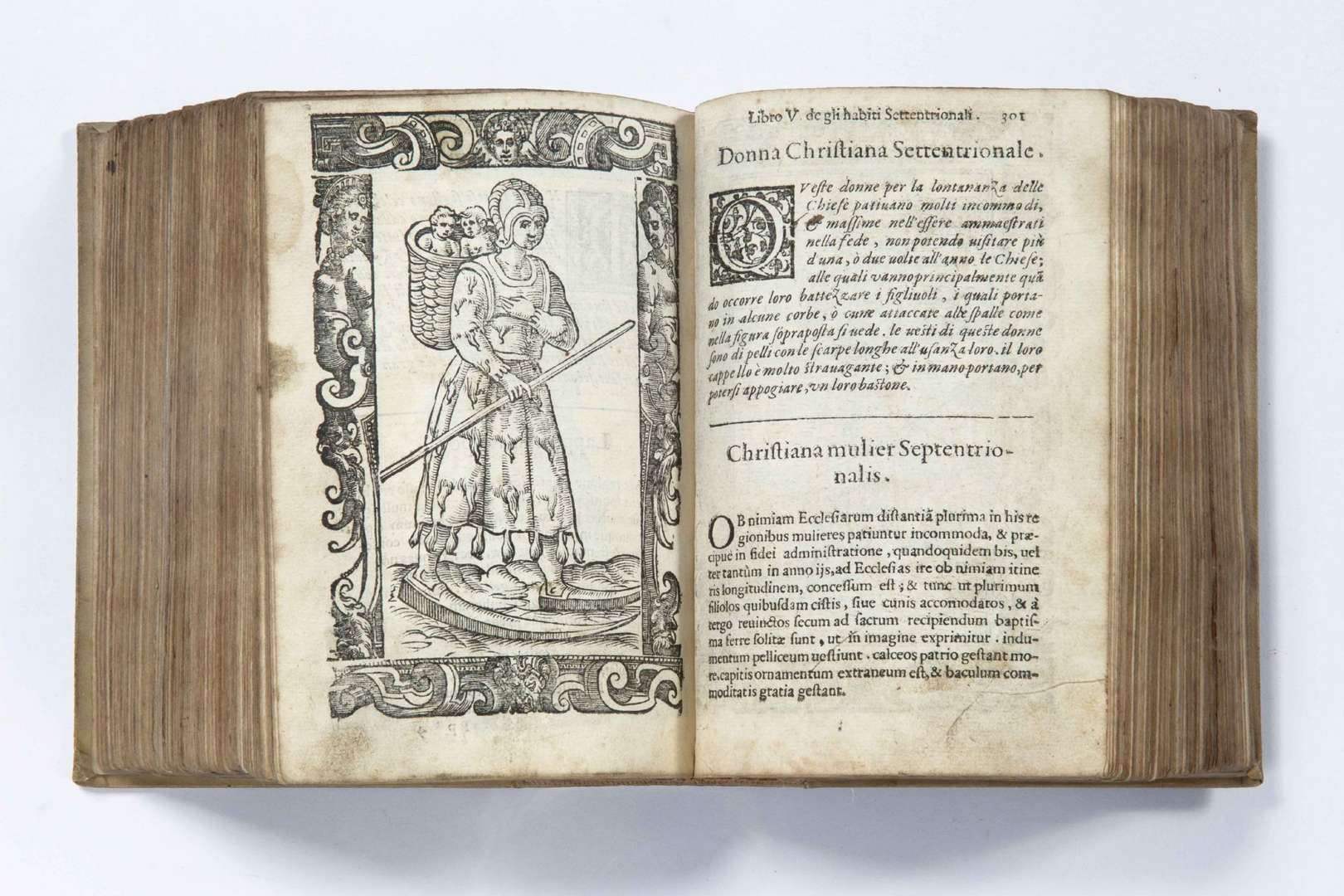 Seconde édition augmentée de cet important recueil de costumes anciens et modernes, composé de plus de 500 figures gravées sur bois à pleine page, et commentées en regard. La première moitié du volume concerne l'Italie, puis viennent les pays d'Europe et le reste du monde connu: Afrique, Asie, Amérique. Vingt planches montrent des personnages d'Amérique du Nord et du Sud: elles ne figuraient pas dans la première édition.
