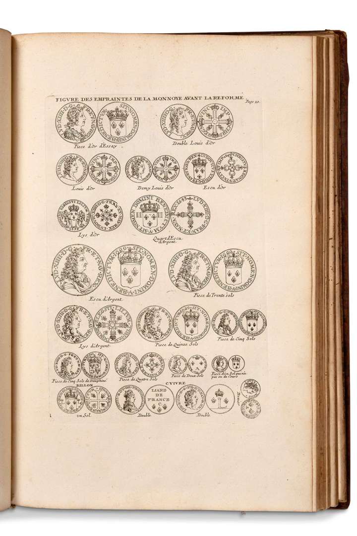 Seconde et dernière édition, corrigée et augmentée. L'ouvrage se compose d'un titre gravé, d'un portrait de l'auteur gravé par Nolin d'après P. Simon et daté de 1688, d'un feuillet de dédicace gravé, d'un frontispice intitulé « L'Histoire du règne de Louis le Grand », non signé, de 80 p. de texte, de 2 vignettes et un cul-de-lampe gravés en tête de l'introduction et du texte, de plus de 80 gravures réparties dans le texte et hors-texte.