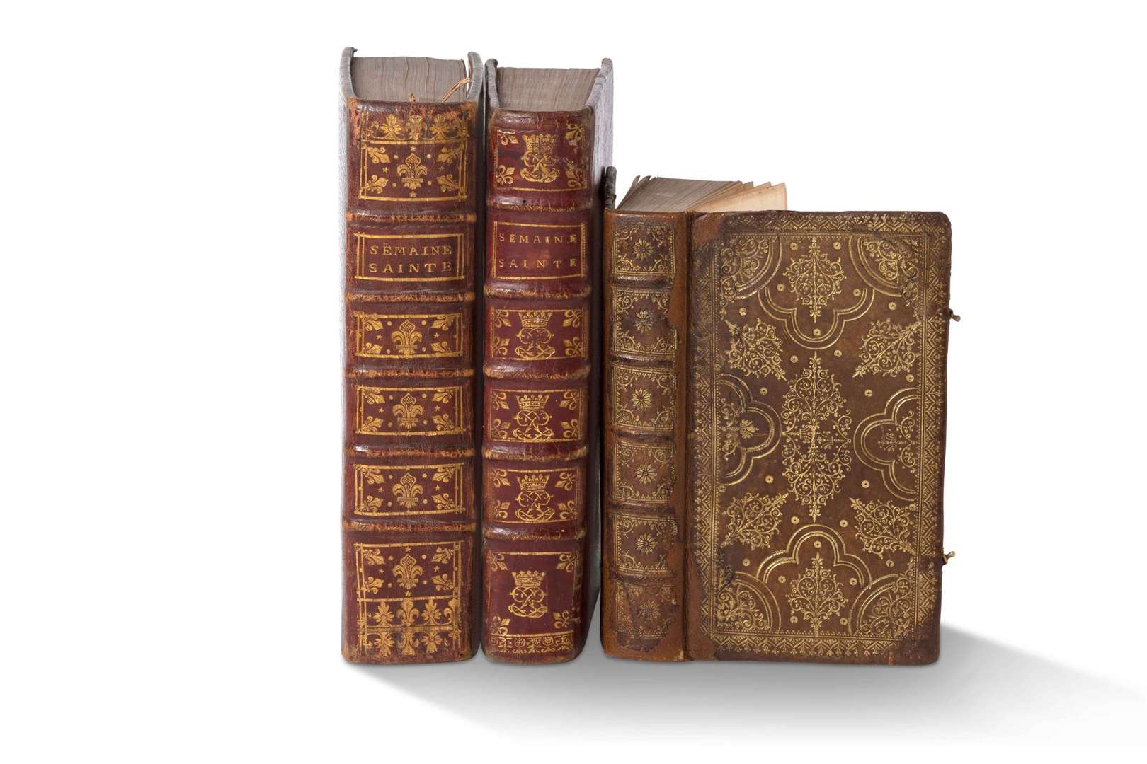 1. OFFICE (L') de la Semaine Sainte, en latin et en françois... dédié à la Reine, pour l'usage de sa Maison. À Paris, chez J.- B. Garnier, 1752. In-8, dos à 5 nerfs, titre doré, caissons fleurdelisés, plats bordés d'un filet avec fleurs de lys en écoinçons, et armes au centre, le tout doré, roulette dorée aux coupes et chasses, tranches dorées (qq. frottements). Avec 2 gravures hors-texte dont une d'après Rubens.
