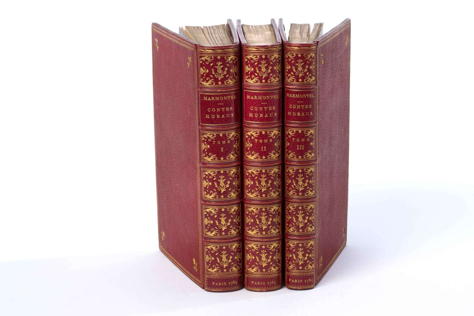 À Paris, chez J. Merlin, 1765. 3 volumes in-8, maroquin rouge, dos à 5 nerfs ornés d'un pointillé doré, auteur, titre, tomaison, lieu et date dorés, caissons ornés aux petits fers, plats bordés d'un triple filet avec fleurons angulaires, le tout doré, double filet doré aux coupes, dentelle intérieure, tranches dorées [Mercier] (infimes frott. aux coupes en pied, rares rousseurs).
