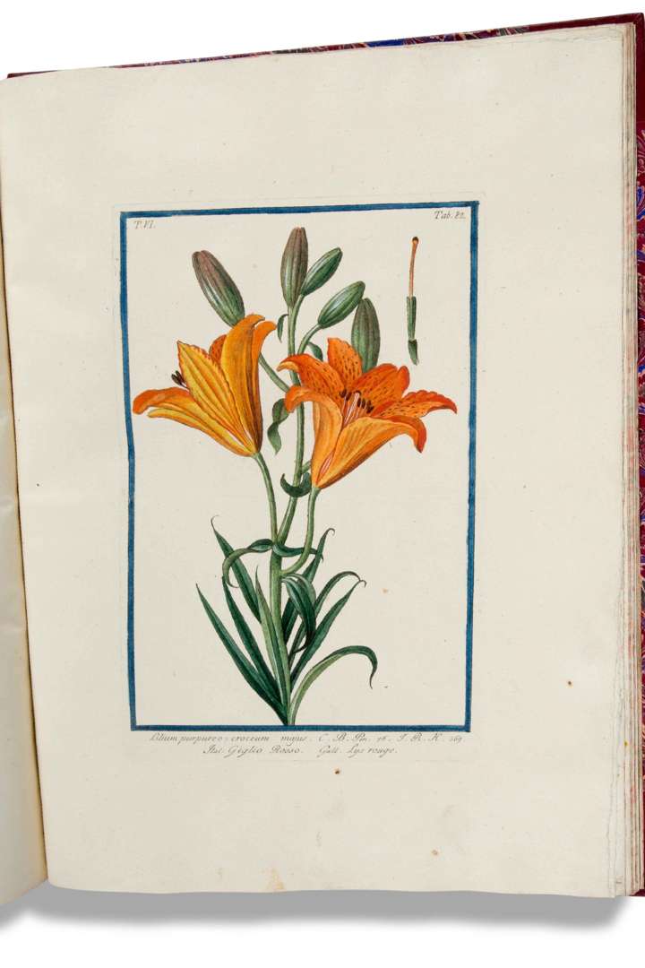 Ces 6 volumes offrent 600 planches de plantes et fleurs gravées et coloriées. Sans les tomes 7 et 8 parus respectivement en 1784 et 1793, qui manquent à la plupart des collections. Chaque page de titre imprimée en rouge et noir est illustrée d'une vignette coloriée.