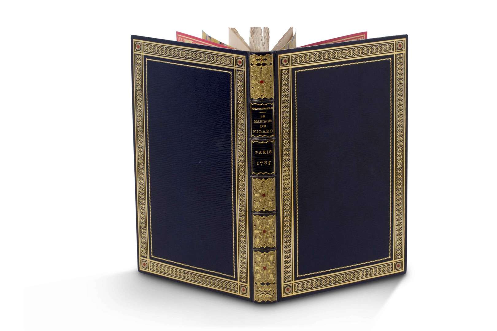 Représentée pour la première fois, par les Comédiens français ordinaires du Roi, le mardi 27 avril 1784. [Kehl], de l'Imprimerie de la Société Littéraire-Typographique, et se trouve à Paris, chez Ruault, 1785. Grand in-8, LI-199 p., [1] f. (errata), pl., maroquin à longs grains bleu marine, dos à 5 nerfs ornés d'un pointillé doré, auteur, titre, lieu et date dorés, caissons richement ornés de fleurons, dorure au pointillé et médaillon mosaïqué, plats bordés d'un cadre géométrique composé d'une roulette, de 2 listels et 2 filets, et d'une autre fine roulette, le tout doré, avec points mosaïqués aux écoinçons, roulette dorées aux coupes et coiffes, contreplats bordés de maroquin orné de 5 filets dorés, doublure et gardes de satin moiré rose bordé d'un filet de d'une frise de sphinges et chimères en fleurons, le tout doré, seconde garde de papier marbré, tranches dorées sur témoins, étui [Noulhac] (lég. frott. à l'étui| rouss. sur certaines pl. et p. 39).