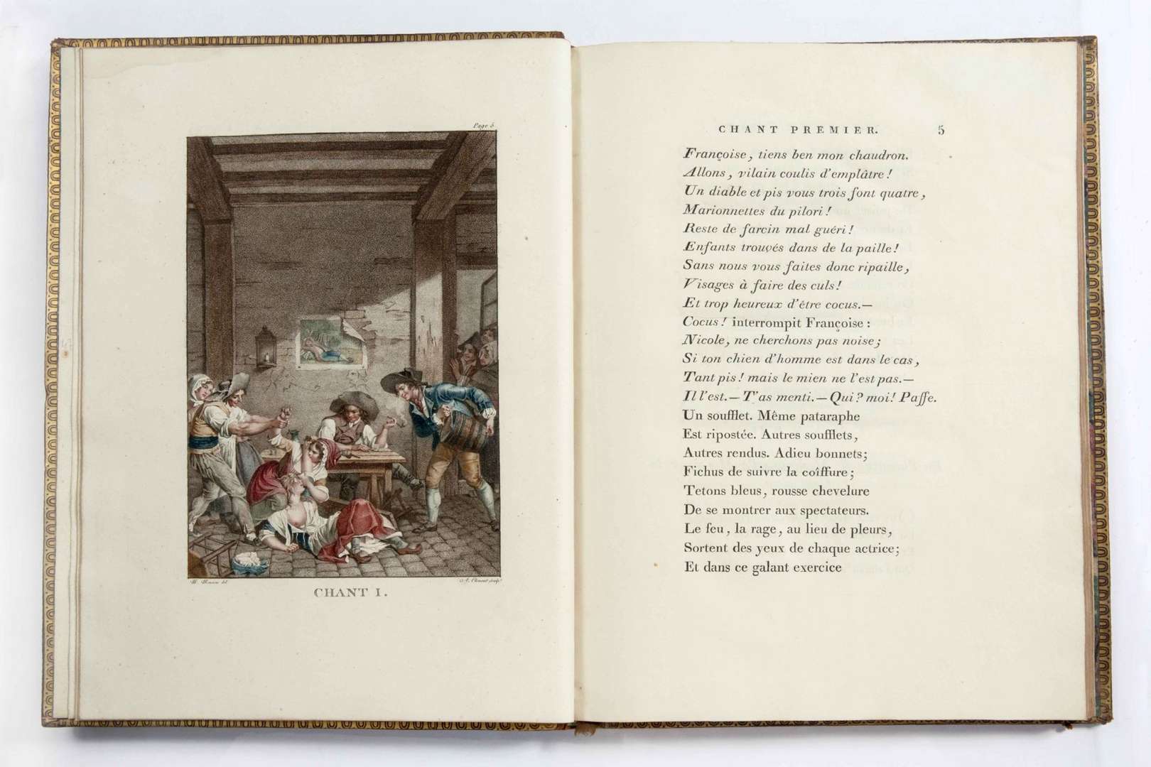 Édition très soignée tirée à 300 exemplaires, illustrée de 4 planches gravées et tirées en couleurs d'après les compositions du peintre Nicolas-André Monsiau (1754-1837). D'après Cohen, les gravures sont de Clément, dont le nom figure seulement sur la première planche de notre exemplaire, la seconde est signée « L. f. », et les deux dernières non signées.